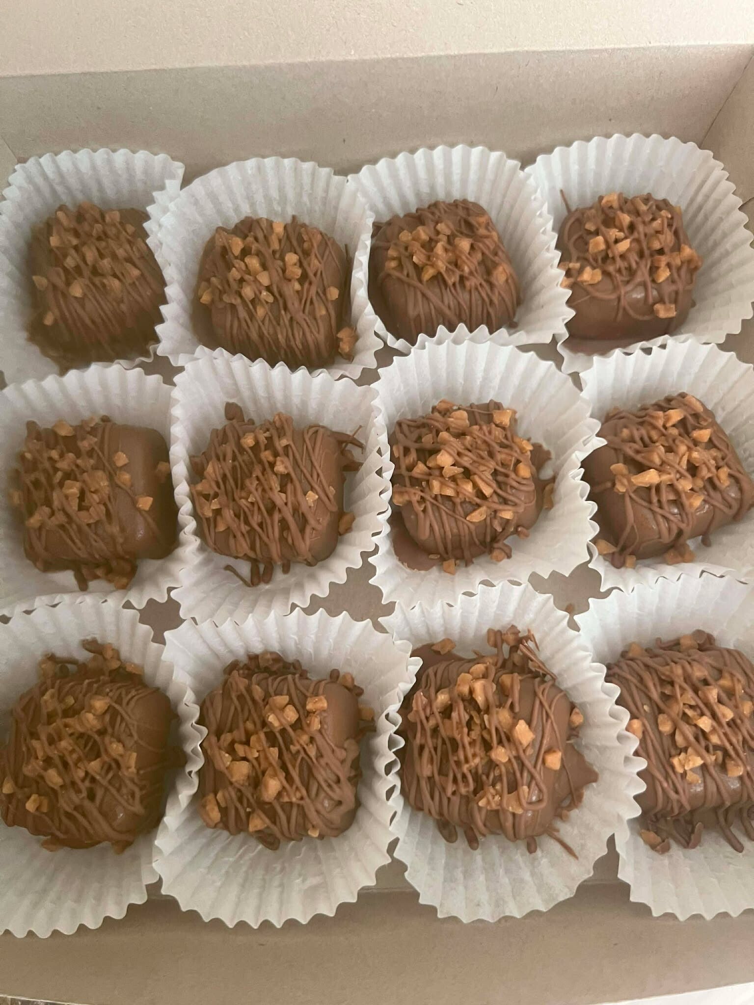 Creamy filling with toffee bits dipped in milk chocolate and topped with more toffee bits